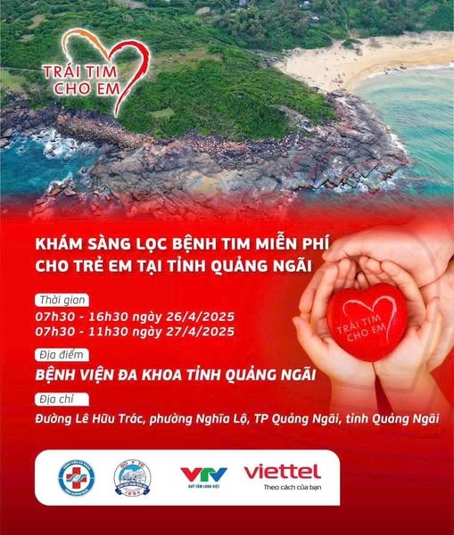 Viettel Quảng Ngãi phối hợp với Quỹ Tấm lòng Việt, các bác sĩ Bệnh viện Trung ương Huế, Bệnh viện Đa khoa tỉnh Quảng Ngãi tổ chức chương trình khám sàng lọc bệnh tin bẩm sinh miễn phí cho trẻ em dưới 18 tuổi tại tỉnh Quảng Ngãi.