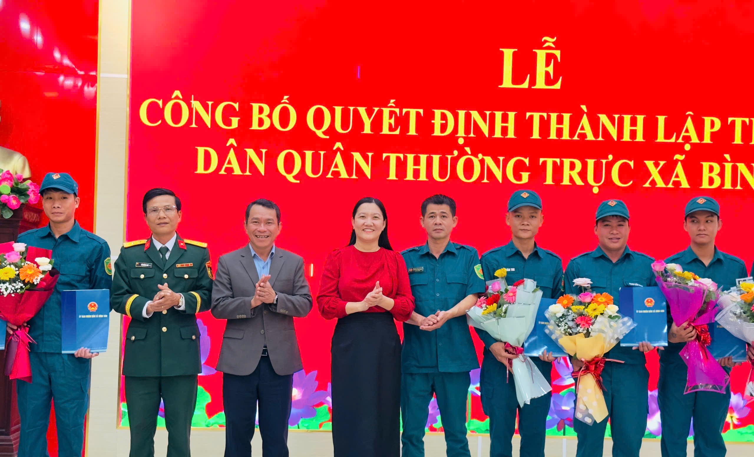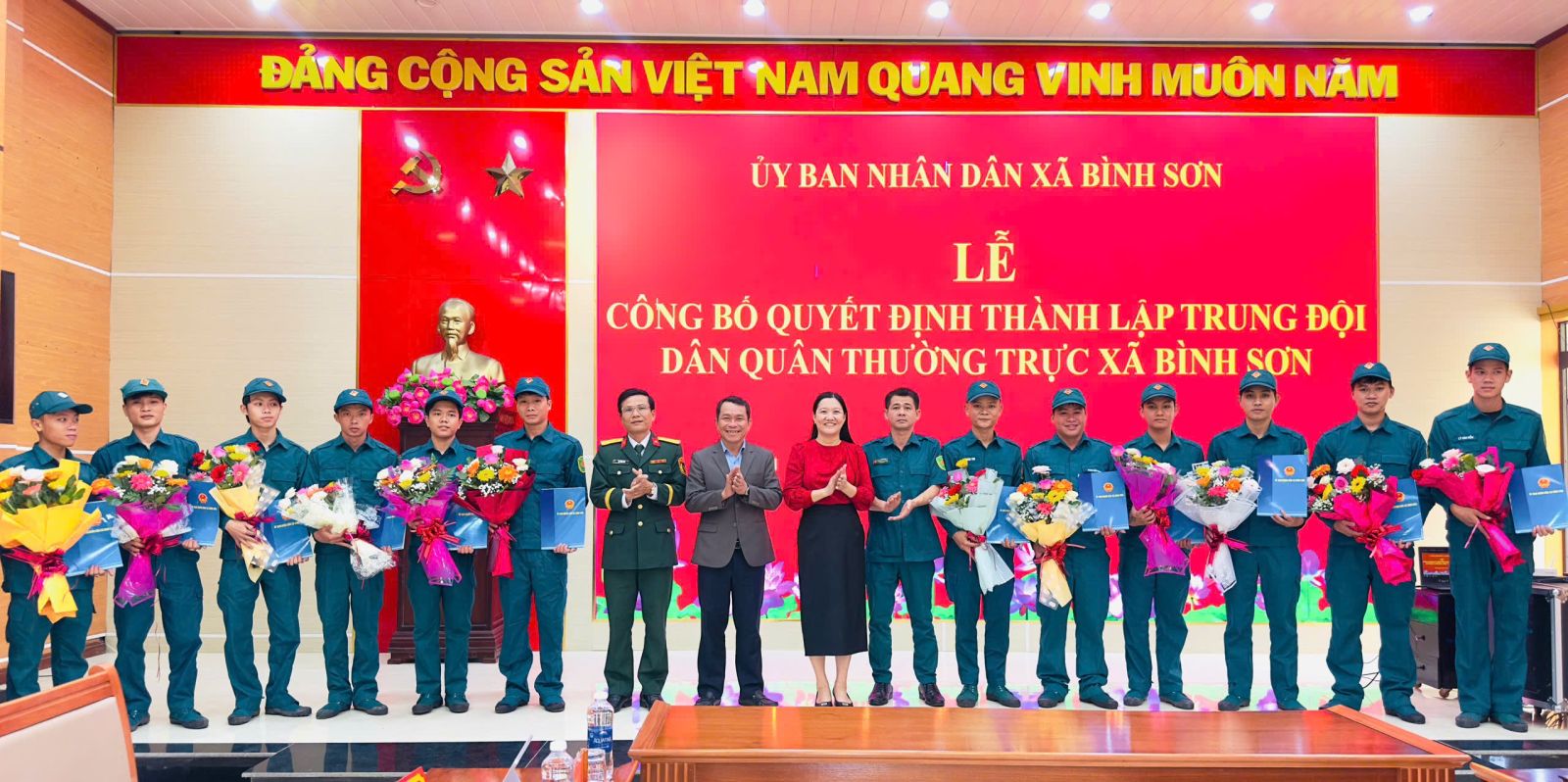Chiều ngày 30/12/2025, tại hội trường Đảng ủy; UBND xã Bình Sơn tổ chức Lễ công bố Quyết định thành lập Trung đội Dân quân thường trực xã . Tham dự buổi lễ có đồng chí Võ Hoàng Linh, Phó Chỉ huy trưởng Ban Chỉ huy phòng thủ Khu vực 1 Sơn Tịnh; đồng chí Võ Văn Đồng, Bí thư Đảng ủy, Chủ tịch HĐND xã; đồng chí Võ Thị Hiền, Phó Bí thư Đảng ủy, Chủ tịch UBND xã; các đồng chí UVBTV Đảng ủy; lãnh đạo các phòng, ban, ngành, đoàn thể địa phương