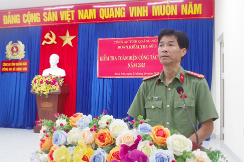 Chiều ngày 24/10/2025, tại Hội trường Công an xã Bình Sơn, Đoàn kiểm tra số 3 Công an tỉnh Quảng Ngãi do đại tá Võ Văn Dương - Ủy viên Ban Thường vụ Đảng ủy, Phó Giám đốc Công an tỉnh làm Trưởng đoàn, cùng lãnh đạo đại diện các phòng nghiệp vụ Công an tỉnh đã tiến hành kiểm tra toàn diện công tác Công an năm 2025 đối với Công an các xã Bình Sơn, Vạn Tường, Đông Sơn, Bình Minh và Bình Chương.