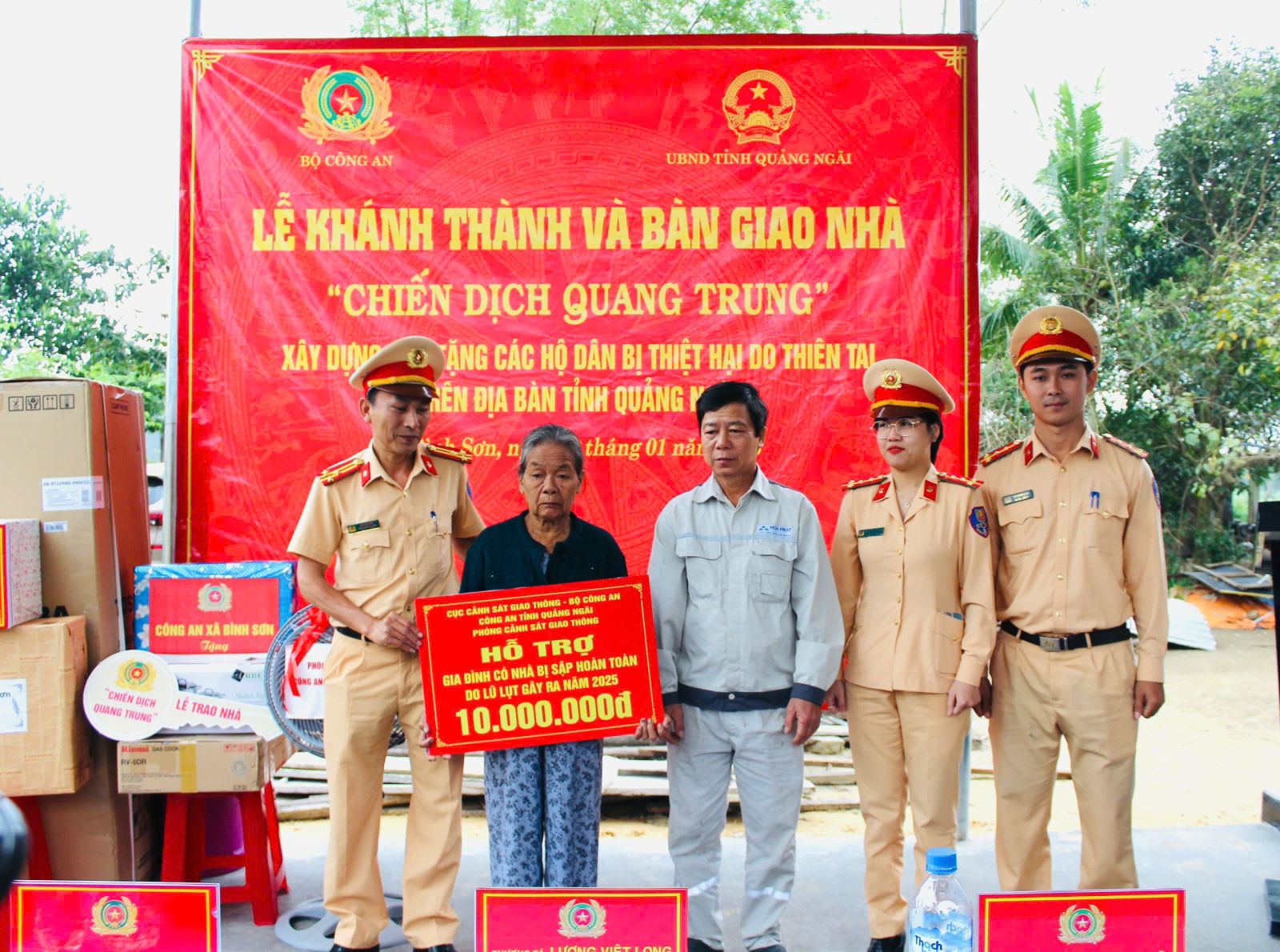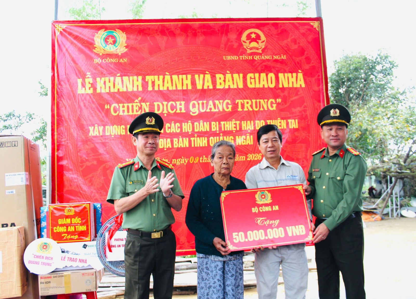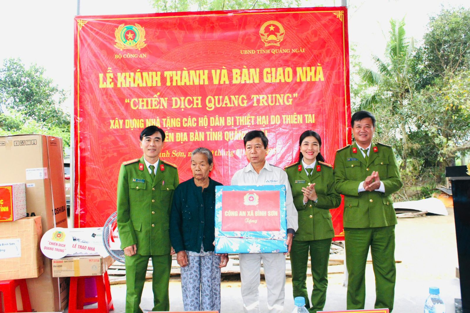 Nhân dịp này, Bộ Công an, UBND tỉnh Quảng Ngãi, Công an tỉnh Quảng Ngãi cùng các đơn vị và chính quyền địa phương đã trao tặng nhiều phần quà ý nghĩa, thiết thực, góp phần động viên gia đình bà Hồ Thị Đồng sớm ổn định cuộc sống.